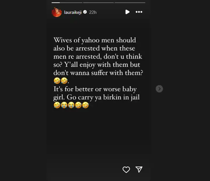 Laura shared on her Instagram that the wives of Yahoo Boys (people involved in online scams) should also be arrested when their husbands get caught. She specifically called for the arrest of Yahoo Boys’ wives, as she believes these women enjoy the money made from the scams but try to separate themselves when the police come after their husbands.